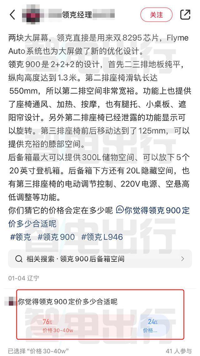 销售透露,领克900预计4-5月上市。还有销售发布了新车价格竞猜,76%的网友选择30-40万。